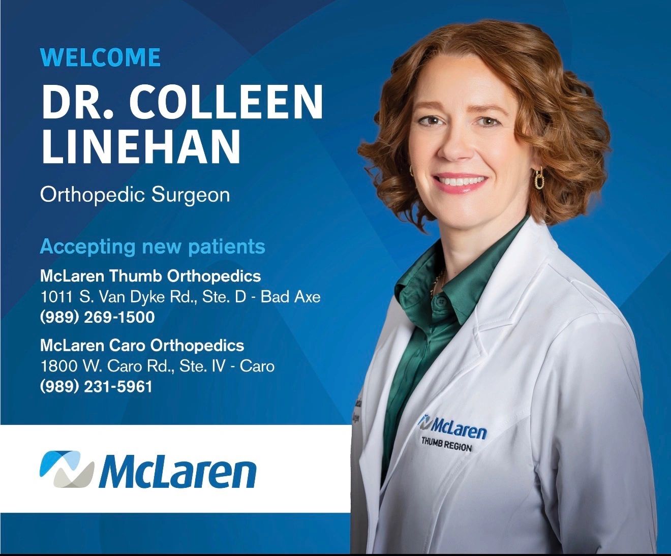 Dr. Colleen Linehan is now welcoming new patients at McLaren Thumb Orthopedics in both Bad Axe and Caro. With advanced surgical expertise and a patient-first approach, Dr. Linehan is committed to restoring mobility, reducing pain, and helping you get back to doing what you love—stronger than before.